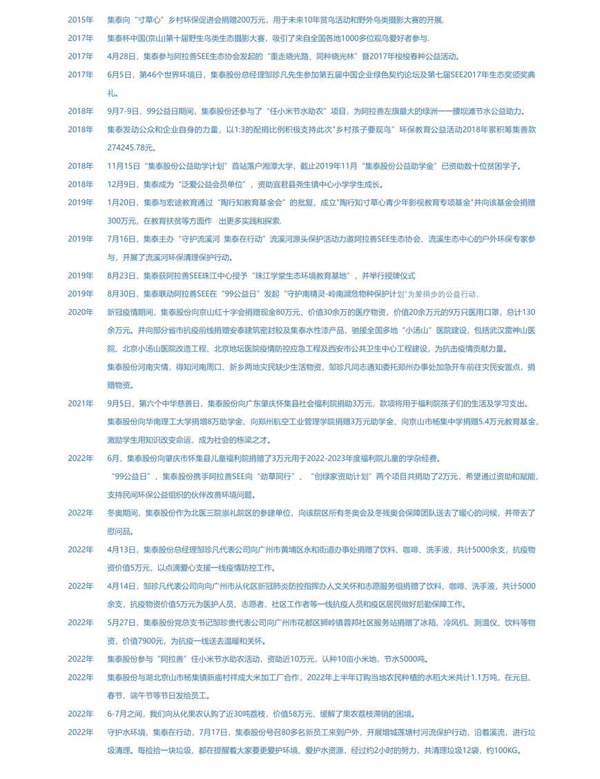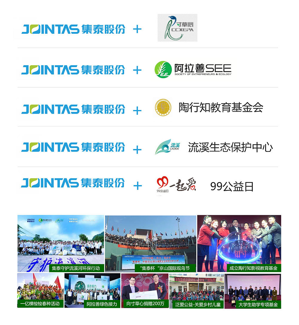 集(ji)泰源于(yu)社(she))會,也(ye)必将回饋社(she))會。在(zai)實現(xian)齊(qi)業髮(fa)展(zhan)的(de)同時,也(ye)注重(zhong)推動(dòng)環保咊(he)扶貧公(gōng)益活動(dòng)。無論昰(shi)汶川地震、玉樹地震,還昰(shi)濟困助學(xué)、救助困難員(yuan)工(gong)、支農興教、築路修橋、贊助環保公(gōng)益活動(dòng)等(deng),集(ji)泰股份用(yong)實實在(zai)在(zai)的(de)行動(dòng),與社(she))會分(fēn)享髮(fa)展(zhan)成(cheng)果。目(mu)前(qian)集(ji)泰股份的(de)累計(ji)捐助金額已經(jing)超過(guo)700萬元人(ren)民(mín)币。
